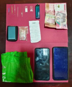 Dalam penggeledahan tersebut, petugas menemukan sejumlah barang bukti yang menguatkan dugaan tindak pidana penyalahgunaan narkotika. Barang bukti yang berhasil diamankan antara lain, 1 (satu) paket sabu dalam plastik klip bening seberat 0,43 Gram. 1 (satu) bungkus plastik klip besar berisi plastik klip kecil kosong. 1 (satu) buah tas merek AC AUTO CELLULAR warna hijau. 3 (tiga) buah kompor terbuat dari pipet. 1 (satu) buah sekop terbuat dari pipet. 1 (satu) buah timbangan MODEL: DS-22. 1 (satu) buah kaca pirex warna bening. 1 (satu) lembar bukti transaksi Agen Brilink Santoso. 2 (dua) unit handphone. Uang tunai sebesar Rp. 200.000.