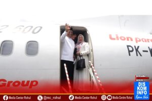 Media Center Rohul – Bupati Rokan Hulu Anton, ST, MM bersama ketua TP PKK Rokan Hulu dr. Yeni Dwi Putri turut mendampingi 58 JCH dalam penerbangan kedua menuju Batam sekira pukul 12.30 WIB, dan Bupati dan Istri didampingi pejabat yang hadir bersalam salaman dengan JCH sebelum masuk ke dalam pesawat di Bandara Tuanku Tambusai Pasir Pengaraian, Jumat (09/05/2025).