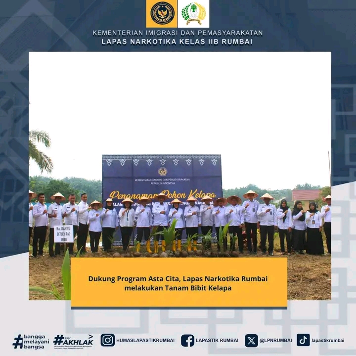 Pekanbaru-Dimatahati.com- Tiga (3) Unit Pelaksana Teknis Pemasyarakatan Rumbai, Lembaga Pemasyarakatan (Lapas) Narkotika Kelas IIB Rumbai, Lembaga Pembinaan Khusus Anak Kelas II Pekanbaru dan Lembaga Pemasyarakatan Terbuka Kelas III Rumbai Bersama Kepala Kantor Wilayah Dirjenpas Riau kembali melakukan penanaman bibit kelapa yang diinisiasi oleh Kementerian Imigrasi dan Pemasyarakatan. Kegiatan yang dilaksanakan serentak di seluruh Indonesia ini merupakan wujud komitmen untuk menyukseskan program ASTA CITA Presiden dan 13 Program Akselerasi Menteri Imigrasi dan Pemasyarakatan. Rabu (10/09/2025)