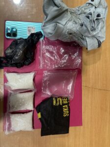 Dalam penangkapan tersebut, pesonel Res Sat Narkoba menemukan sejumlah barang bukti, antara lain, 3 (tiga) paket narkotika jenis sabu yang dibungkus plastik putih bening, 2 (dua) lembar plastik putih bening tambahan, 1 (satu) lembar plastik asoi warna hitam, 1 (satu) tas kain bertuliskan “Suka Berkawan Ponsel” warna hitam, 1 (satu) jaket berwarna abu-abu, 1 (satu) unit handphone merek Itel warna biru dengan nomor simcard 0812-××××-××××