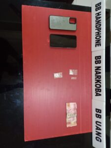 Melihat gerak geriknya yang mencurigakan, Tim langsung melakukan penggerebekan dan pada saat penggerebekan tim berhasil menemukan 2 (dua) paket yg diduga berisikan Narkotika jenis sabu didalam plastik klem yang pada saat penggerebekan dijatuhkan oleh tersangka yang ketika itu mengaku bernama YM alias Bjg (26 Tahun).