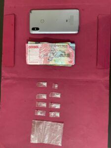 Tersangka diamankan beserta barang bukti berupa 08 (delapan) Paket Narkotika jenis sabu yang dibungkus Plastik klip warna Putih Bening, 1 (satu) lembar plastik klip warna putih bening, Uang tunai sebesar Rp. 303.000,- (tiga ratus tiga ribu rupiah), dan 1 (satu) unit Handphone merk Xiaomi warna ungu.