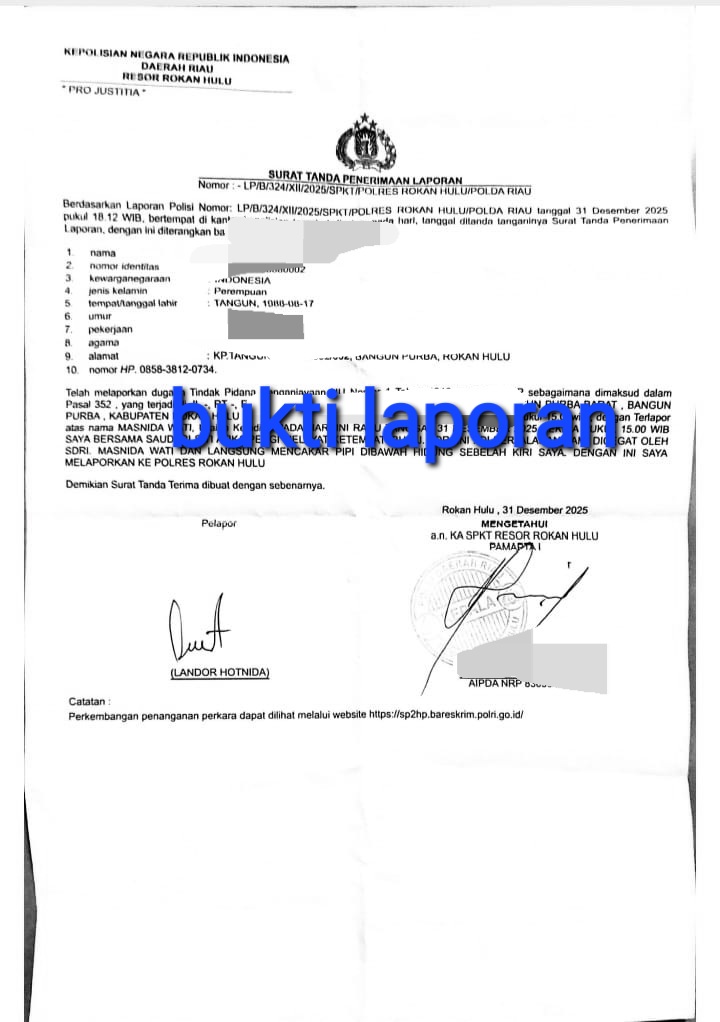 ROKAN HULU — Seorang oknum aparatur sipil negara (ASN) guru di salah satu sekolah di Bangun Purba berinisial MW dilaporkan ke Polres Rokan Hulu, Riau, atas dugaan penganiayaan terhadap warga bernama Landor Hotnida (37). Insiden terjadi pada Rabu, 31 Desember 2025, sekitar pukul 15.00 wib di Desa Bangun Purba Barat, Kecamatan Bangun Purba, Kabupaten Rokan Hulu, Provinsi Riau.