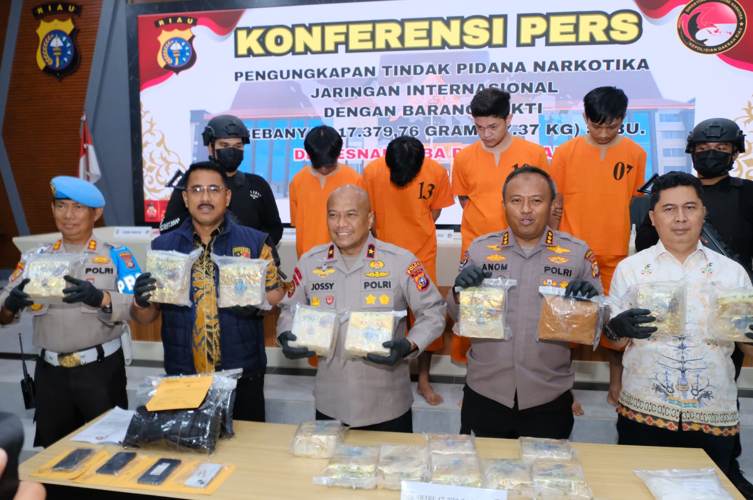 Konferensi pers yang digelar di Media Center Polda Riau pada Kamis (15/5) ini dihadiri oleh Wakapolda Riau Brigjen Pol Jossy Kusumo, Dirresnarkoba Kombes Pol Putu Yudha Prawira, serta Kabid Humas Kombes Pol Anom Karibianto.