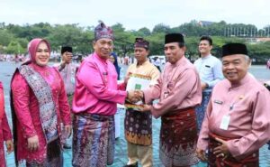 Rohul – Upacara Peringatan Hari Jadi Kabupaten Rokan Hulu (Rohul) Ke-26 Langit mendung dan rintik hujan turun membasahi bumi Negeri Seribu Suluk. Namun, semangat tak surut ratusan peserta dan undangan tetap berdiri tegap mengikuti mengikuti rangkaian kegiatan upacara yang digelar dengan penuh khidmat di halaman Kantor Bupati, Minggu (12/10/2025)