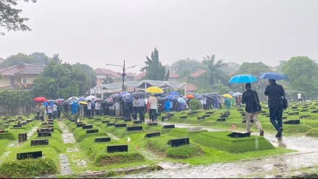 Sebagian pelayat tampak menggunakan payung atau jas hujan. Namun, para pelayat tetap mengikuti prosesi pemakaman dengan khidmat