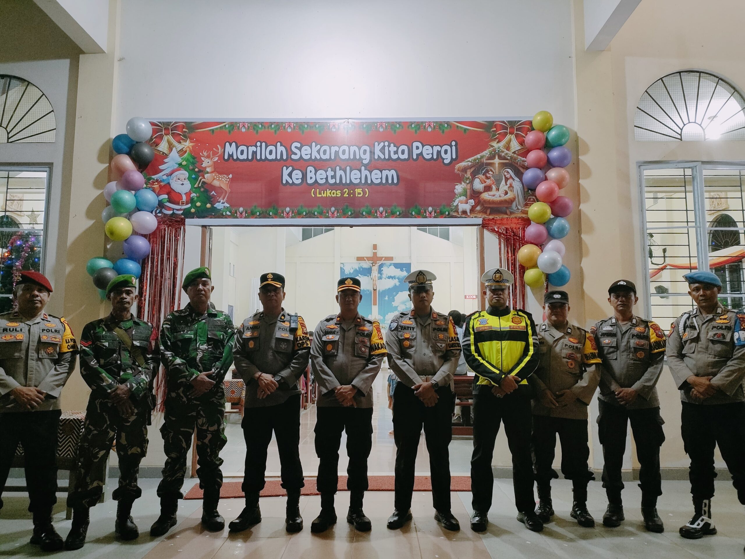 Selain memeriksa kesiapan petugas pengamanan, rombongan juga memberikan arahan kepada personel dan berinteraksi dengan masyarakat yang hadir di lokasi gereja. Suasana keakraban terlihat saat Wakapolres dan jajaran melakukan sesi foto bersama para petugas dan jemaat.